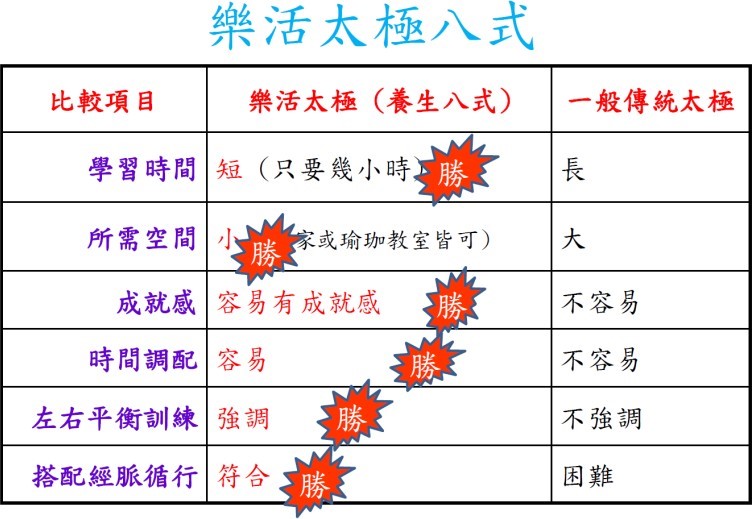但大部分的太極拳套路,很難符合經脈運循行的規律練習,為了符合現在大眾的需求,因此依太極拳的招式精華與經脈的循行,編篡一套符合忙碌的人練習的「樂活太極」,此套路只有八個招式,可以單邊練習,雙邊練習,甚至可以十字或米字型練習,其優點如表說明。