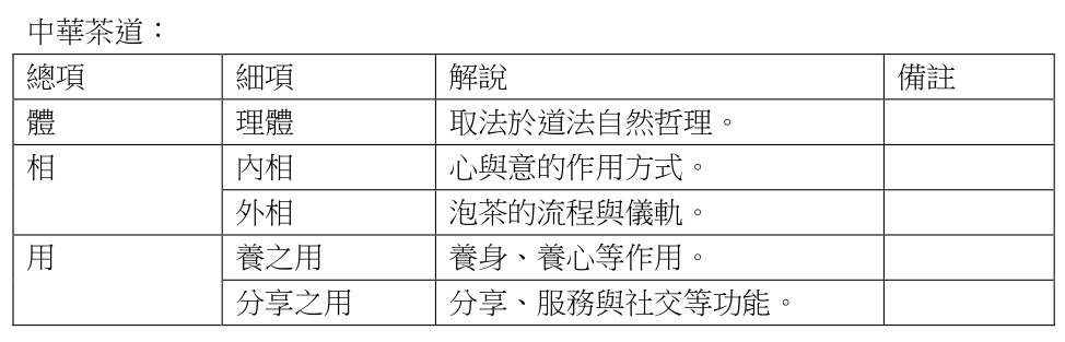 現在以佛教華嚴宗的體、相、用來簡單分析茶道與太極拳的內涵,以便說明其間相互關係,所謂的「體」是指「理體」,「相」是指「相貌風格」的展現,「用」是指「功用」效果,為了容易理解,先以表格來做簡單說明: